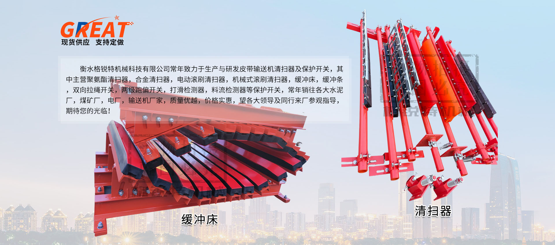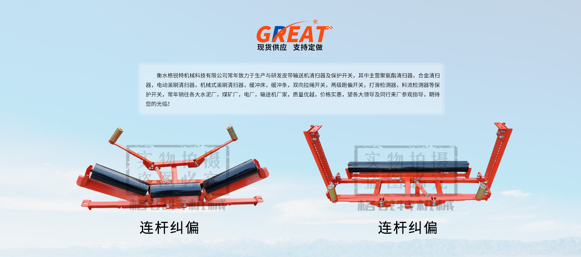 衡水格銳特機(jī)械科技有限公司常年致力于生產(chǎn)與研發(fā)皮帶輸送機(jī)清掃器及保護(hù)開(kāi)關(guān),其中主營(yíng)聚氨酯清掃器,合金清掃器,電動(dòng)滾刷清掃器,機(jī)械式滾刷清掃器,緩沖床,緩沖條,雙向拉繩開(kāi)關(guān),兩級(jí)跑偏開(kāi)關(guān),打滑檢測(cè)器,料流檢測(cè)器等保護(hù)開(kāi)關(guān),常年銷(xiāo)往各大水泥廠,煤礦廠,電廠,輸送機(jī)廠家,質(zhì)量?jī)?yōu)越,價(jià)格實(shí)惠,望各大領(lǐng)導(dǎo)及同行來(lái)廠參觀指導(dǎo),期待您的光臨!!!